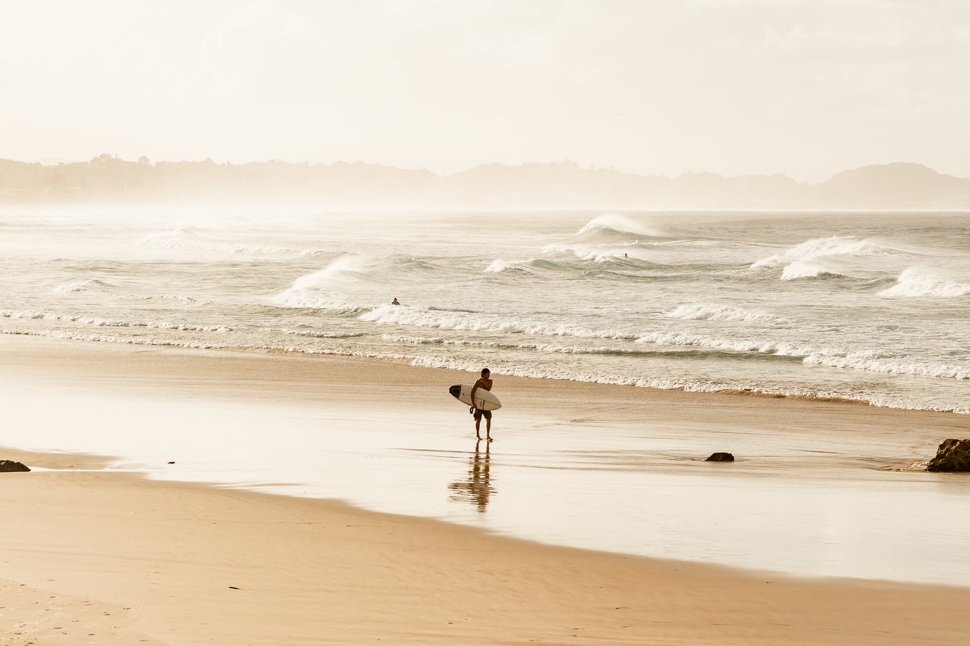 5 days prior to Cyclone Alfred hitting land, the surf was pumping on the Goldy. A young surfer walks back along the beach towards Kirra Point for some more waves.